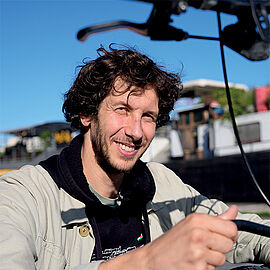 « Je suis auteur-compositeur-interprète et je me rends à vélo au niveau de la station de métro Hoche, dans le studio de musique où je travaille actuellement. Je passe également par le canal pour déposer mes enfants à la crèche et à l’école. Je fréquente aussi la péniche Metaxu où, d’ailleurs, je donnerai un concert le 27 novembre. Pour moi, la place de la Pointe et ses abords sont devenus la nouvelle place du village ! Il y a assez peu d’endroits dans le monde où le cours d’eau de la ville est aussi accessible. J’ai voyagé à Londres et à New York et je n’ai pas le souvenir de quais aménagés ainsi. Parfois, sur les rives de l’Ourcq, j’ai l’impression d’être au bord de la mer. J’y ai croisé des cygnes, des hérons... et, surtout, on y voit le ciel, ce qui est rare en milieu urbain. Cela m’apaise.»