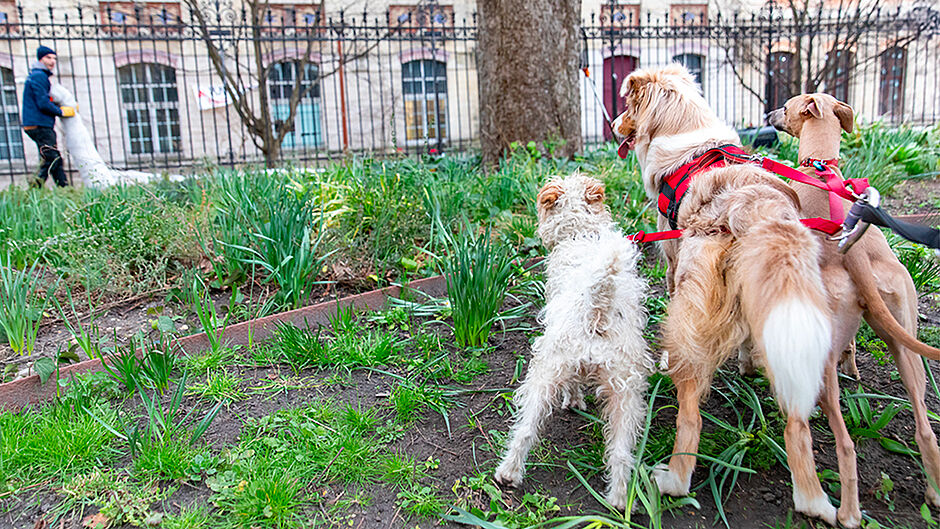 Dans le square Salvador-Allende, près de la gare RER, le lévrier, le berger australien et le fox-terrier sont prêts à bondir. Les museaux pointés vers la sortie d’un terrier, les trois chiens savent qu’ils n’auront que quelques secondes pour capturer le ou les rats sur le point d’être délogés de leur galerie souterraine.