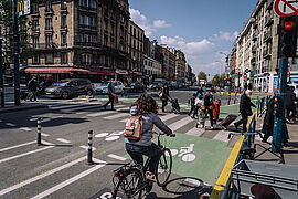 « Pantin est un peu devenue le laboratoire de ce qu’il faudrait faire en Île-de-France », s’enthousiasme Louis Bellenfant, directeur du Collectif Vélo Île-de-France qui regroupe une trentaine d’associations d’usagers, lorsqu’on l’interroge sur le nouveau carrefour à la hollandaise de l’avenue Jean-Lolive. Mais de quoi s’agit-il ? Tout simplement d’une large bande cyclable de couleur verte. Faisant le tour du carrefour, elle est protégée par de petits poteaux. « C’est aux intersections que se produisent la majorité des accidents graves, poursuit Louis Bellenfant. Ici, la piste suit une forme de carré et les cyclistes risquent moins de se retrouver pris dans un angle mort ! »