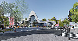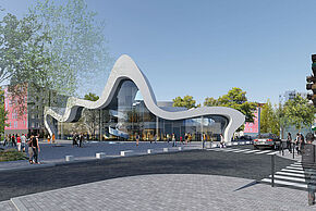 Signature de l’architecte Jean-Pierre Lott, sa façade vitrée extérieure, tout en courbes, s’habillera de mosaïques blanches rappelant celles, colorées, des immeubles du Serpentin. En fin d’année, l’équipement s’ouvrira sur un parvis en pierre parsemé d’îlots végétalisés et de jeux d’eau.