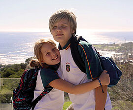 Alistair et Zoé portant l’uniforme dans leur école de Camp Bay au Cap, en Afrique du Sud. Les cours s’arrêtent à 14.00, ce qui laisse tout l’après-midi pour faire du surf ou observer les animaux marins.