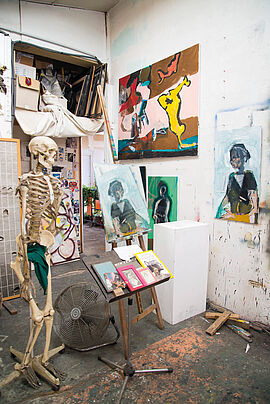 Au premier étage, Myriam Suriam boit un thé en regardant une toile qu’elle doit terminer. « Je suis arrivée ici quand je suis sortie des Beaux-Arts. Comme la plupart des occupants, j’ai découvert cet endroit par l’intermédiaire d’un ami. On y entre par le bouche-à-oreille. » Ce lieu lui a plu immédiatement : la proximité avec Paris, le tarif attractif du loyer, le côté bohème… « Je croise des peintres, des sculpteurs, des photographes passionnants de toutes les nationalités – des Japonais, des Coréens, des Colombiens, des Portoricains… – et de tous âges. Il n’y a ni stars ni peintres du dimanche ici. »