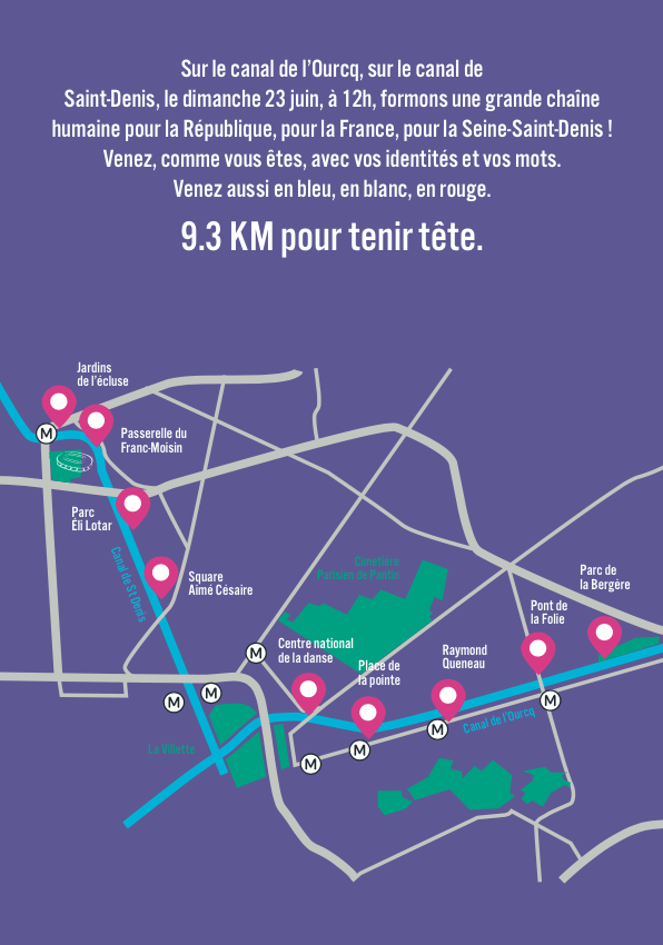 Cette initiative propose de former le long des canaux de l’Ourcq et de Saint-Denis une chaîne humaine de 9,3 KM qui matérialise la détermination des habitants de Pantin et du département tout entier à défendre nos valeurs humanistes.
