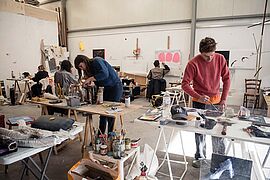 Derrière une porte de garage, se nichent cinq ateliers partagés par huit artistes œuvrant dans les domaines de la peinture, de la gravure ou de la modélisation de vêtements.