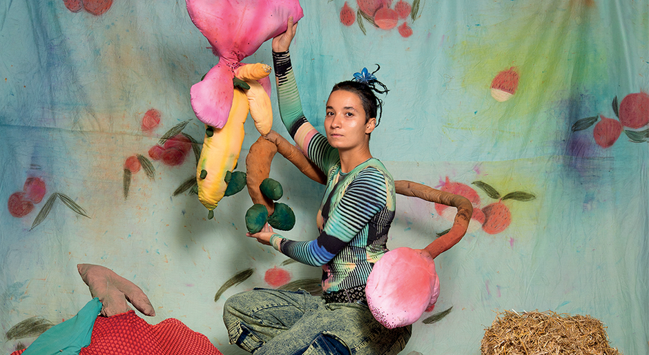 Diplômé·e en textile de l’école Duperré, ainsi que de la Gerrit Rietveld Academie d’Amsterdam, Rozy Tergemina Sapelkine, artiste pluridisciplinaire (perruquier·e, sculpteur·rice, costumier·e…), à l’univers saturé de couleurs, s’inspire des traditions populaires – kermesses, arts de la rue, carnavals, drag shows, récits de l’océan Indien –, mais aussi de l’artisanat. Son art évoque également les mondes non humains – fruits, légumes, plantes, animaux… – qui livrent leur propre récit. « Mes créations s’avancent comme des fables à dimensions sociale, politique et poétique », éclaire cette résident·e d’Artagon.