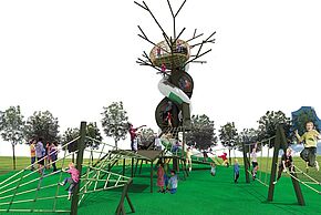 Adapté à tous les enfants à partir de 3 ans, le parcours, tracé sur un terrain naturellement vallonné, comprendra plusieurs cabanes perchées plus ou moins haut, reliées entre elles par des ponts de cordes et des passerelles afin de constituer un parcours acrobatique à arpenter d’un bout à l’autre du square. Un gazon synthétique, posé sur un sol amortissant, assurera la sécurité des plus intrépides. Des bancs et des jeux d’eau compléteront cet espace organisé autour « d’îles arbustives », intégrant les arbres existants.