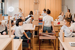 Pour autant, cette exposition ne saurait être purement architecturale. Elle propose, en dialogue, un regard artistique, sensible et ludique, dont le commissariat est assuré par Anna Labouze et Keimis Henni. Ainsi, plusieurs installations, interactives ou non, imaginent cette école idéale. Le Quilt des écoles, grand tapis communautaire, création de l’artiste, chercheuse et enseignante Marie Preston, interroge les modes de fonctionnement des établissements alternatifs, tandis que son Compodium cherche à réunir l’ensemble de l’écosystème (parents, professeurs…) d’une école maternelle. Les vidéos de Thomas Tudoux jettent, quant à elles, un regard sur les systèmes de notation ou échangent les rôles. Dans Entends-tu le bruit des oiseaux ?, de Sonia Chiambretto, une installation sonore mêle les pépiements des volatiles aux voix des enfants.