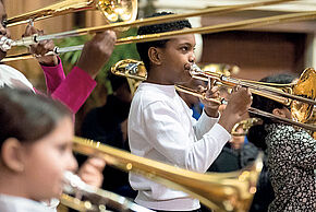 Porté par la Philharmonie de Paris dans les quartiers relevant de la politique de la ville, Démos permet un apprentissage de la musique à des enfants éloignés de cet art. À Pantin, ils ont entre huit et dix ans, sont scolarisés à l’école Sadi-Carnot et fréquentent le centre de loisirs Les Gavroches.« Ils découvrent la pratique des cuivres en collectif. Notre pédagogie s’appuie principalement sur l’oralité, mais les élèves se familiarisent aussi à la lecture des notes sur une portée », explique Pascal Benech.