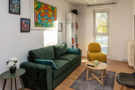 À l’entrée de l’établissement, l’appartement studio, comme il est surnommé, se situe au-dessus du logement de la gardienne. Une fois la porte rouge franchie et les escaliers montés, ce sont trois guitares décoratives subtilement éclairées qui attirent l’œil.