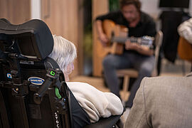 Dans des fauteuils roulants, de frêles mains battent la mesure. Surtout, les yeux pétillent. « Quelle bouffée d’air ! », soufflent Marie-Françoise et Julia, respectivement épouse et fille de Pierre, résident de La Seigneurie. À leurs côtés, la fringante Françoise, résidente elle aussi, explique : « Ici, c’est mon refuge. J’y passe tout mon temps. C’est un petit goût de ma vie d’avant. »